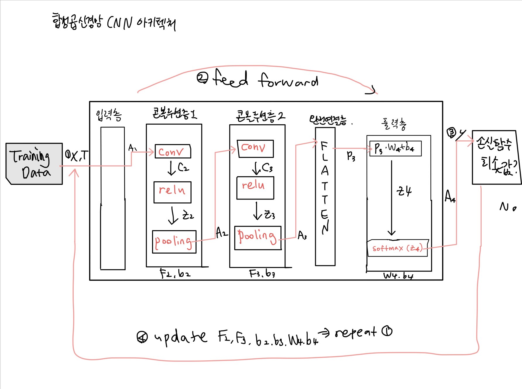 기본신경망 아키텍처처럼 2.피드포워드 수행과 3.cross-entropy로 비교 4. 오차역전파로 손실함수 최소가 될때까지 가중치와 바이어스 최적화 구조는 동일합니다.