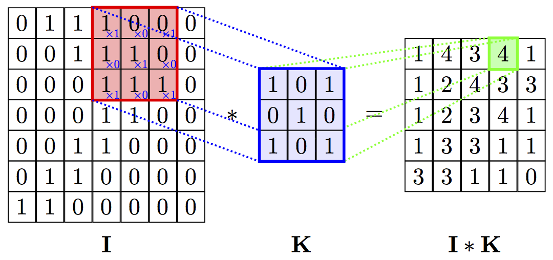 입력데이터 I 와 필터 K를 각각 곱하고 더해서 I*K에서 4라는 값을 도출해냅니다.
