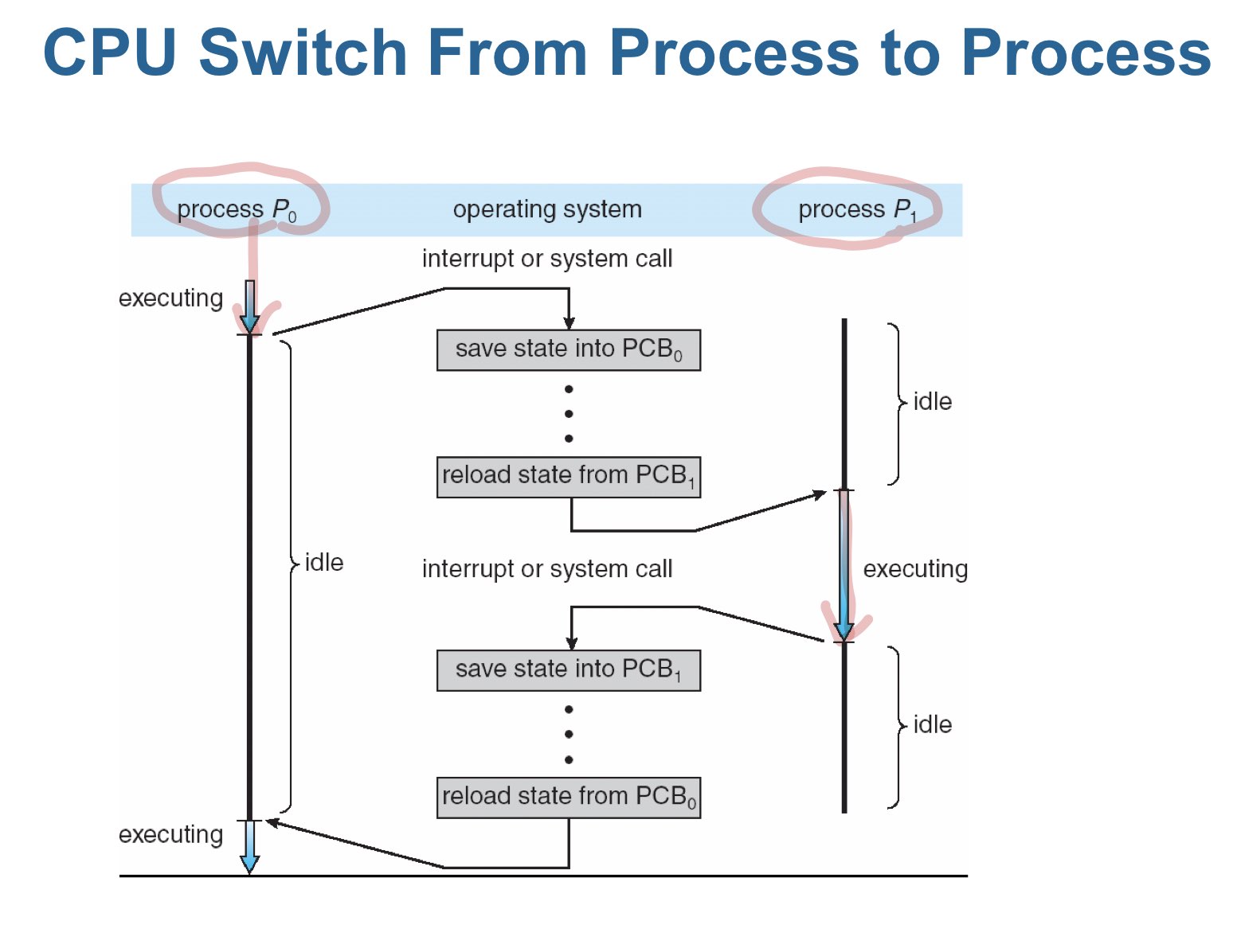 그래서 OS는, CPU(하드웨어) 효율을 높이기 위해서, CPU위에 올라가는 프로세스들을 time sharing하며 switch합니다