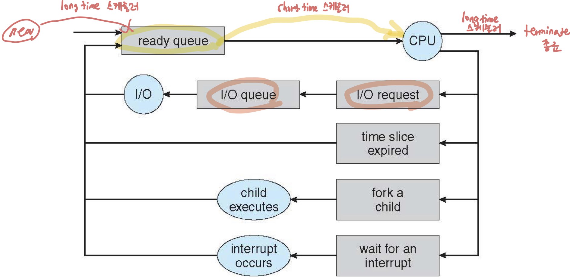 -Long-term scheduler (or job scheduler) : 어떤 작업을 커널에 등록해 프로세스로 만들어줄 것인가. ready queue에 들어갈지 결정합니다. multiprogramming 정도를 조절하는 역할입니다.