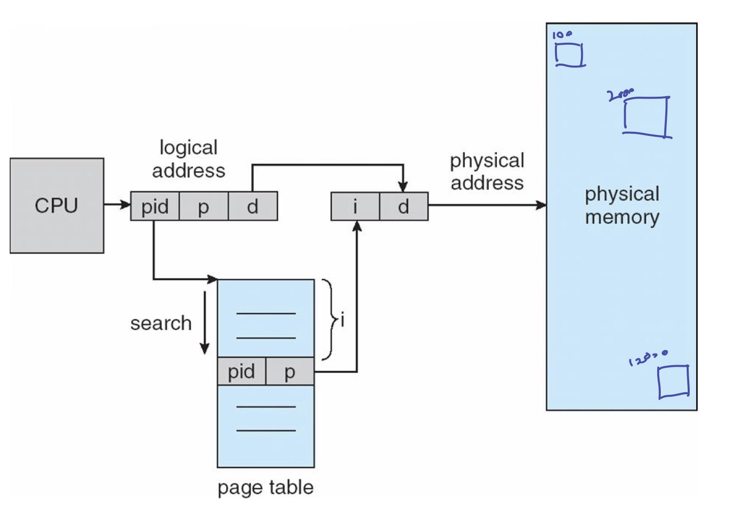 이 테이블은 logical의 개념을 뒤집어서 page table에 physical의 개념을 주로 다룬 것입니다. 내 pid와 physical address를 다 찾아서 physical offset를 더해서 구합니다.