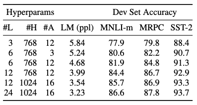 LM(ppl)은 masked LM perplexity(헷갈리는 정도)로 낮을수록 좋음. 그래서 #L과 #H가 점점 커지는(크기가 점점 커질수록) 성능이 좋아진다는 것을 확인할 수 있음.
